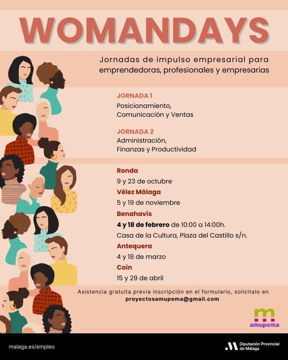 La Diputación de Málaga y la Asociación de Mujeres Profesionales y Empresarias de Málaga (AMUPEMA) celebrarán en Benahavís la tercera edición de Womandays, jornadas de formación y networking dirigidas a mujeres empresarias y emprendedoras. Las sesiones tendrán lugar los días 4 y 18 de febrero en la Casa de la Cultura del municipio, en horario de 10.00 a 14.00 horas. La inscripción es gratuita y las plazas se asignan por orden de solicitud.