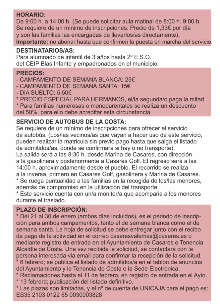 El campamento de Semana Blanca se celebrará del 23 al 27 de febrero, mientras que el de Semana Santa tendrá lugar del 30 de marzo al 1 de abril. Ambas actividades están dirigidas a menores empadronados en Casares, desde los 3 años (Educación Infantil) hasta 2º de la ESO.