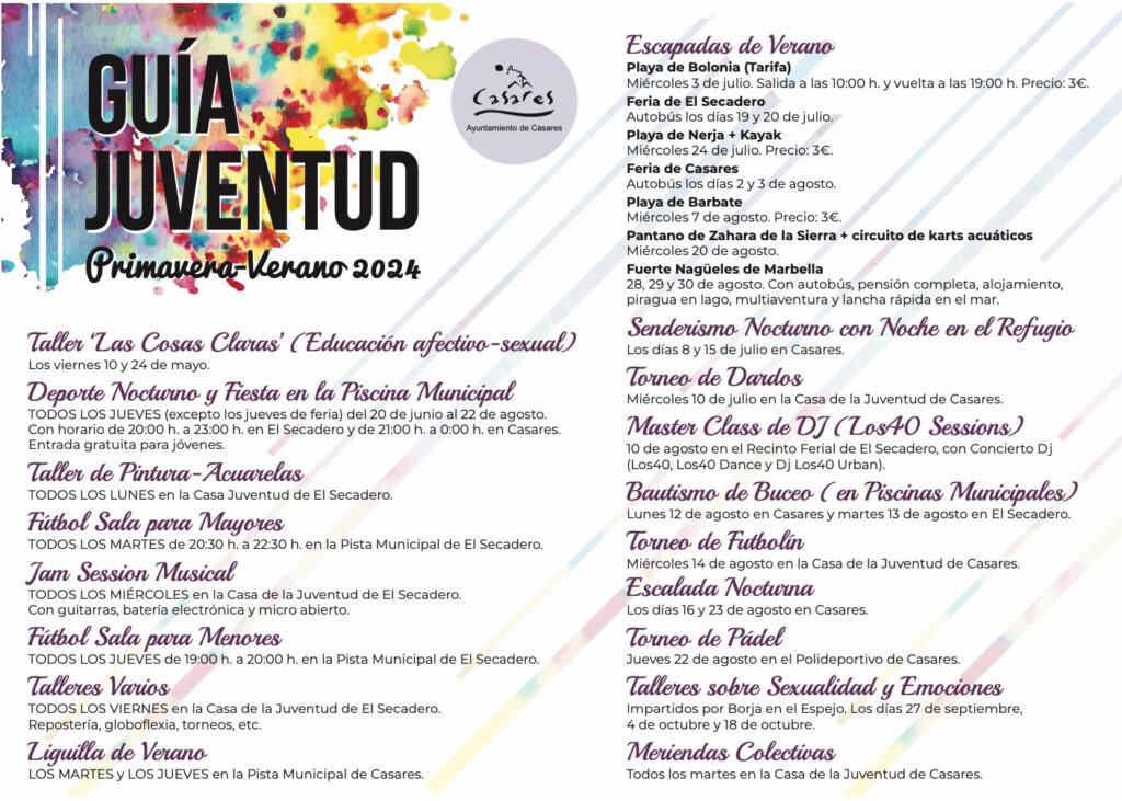 Talleres de educación afectivo-sexual, masterclass y concierto de Los40, escapadas para practicar multiaventura, karts acuáticos en pantano y kajak en la playa,… son algunas de las actividades impulsadas desde la Concejalía de Juventud del Ayuntamiento de Casares