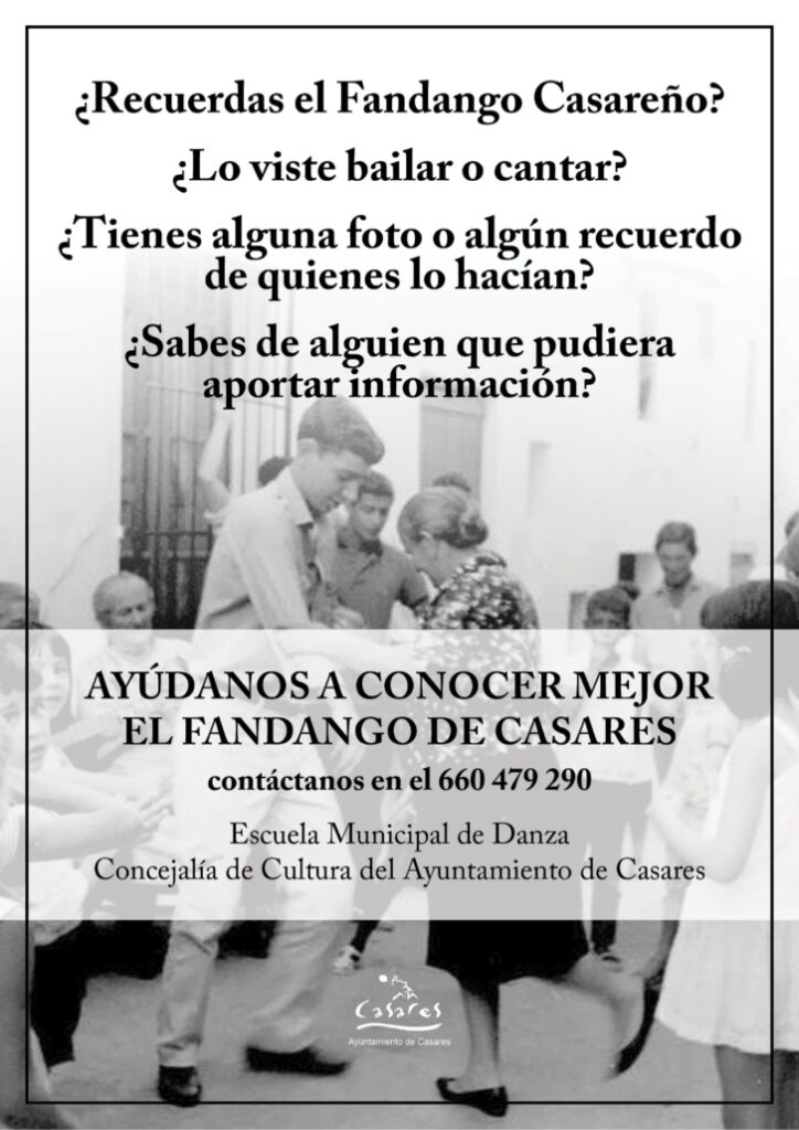 Todas las personas que puedan aportar un recuerdo, una foto, cualquier testimonio sobre el antiguo fandango casareño se pueden pasar por la Escuela de Danza, la Concejalía de Cultura del Ayuntamiento de Casares o ponerse en contacto por teléfono o whatsapp en el 660479290.